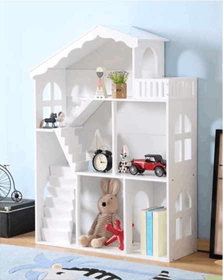 Get your little one excited about arranging toys, storybooks, and fun knick-knacks in our classic Kid's white dollhouse bookcase. Every turn and landing of this lovely storage space will spark your child’s imagination. Hand-painted and carved with love, this essential pick will brighten up any corner of your child’s bedroom or play area. Unlike a regular dollhouse, this one features a playful but practical design. With this dollhouse bookshelf, there’s a place for everything, and your little munchkin will also enjoy putting everything back in place after playtime.